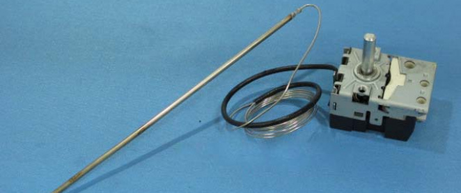 Термостат представляет собой неотъемлемый компонент духового шкафа. Он контролирует температуру внутри камеры, включая и выключая нагрев. Этим элементом оснащаются как газовые, так и электрические плиты. Запчасть расположена за ручкой-регулятором с делениями температурного режима.